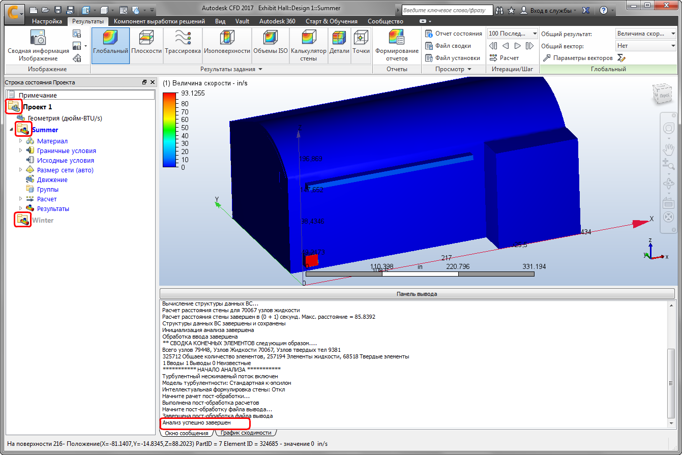 Прим.: Когда обе имитации завершены, значки "Запуск" исчезают из строки "Исследование проекта", и "Анализ успешно завершен" отображается в строке "Вывод":
