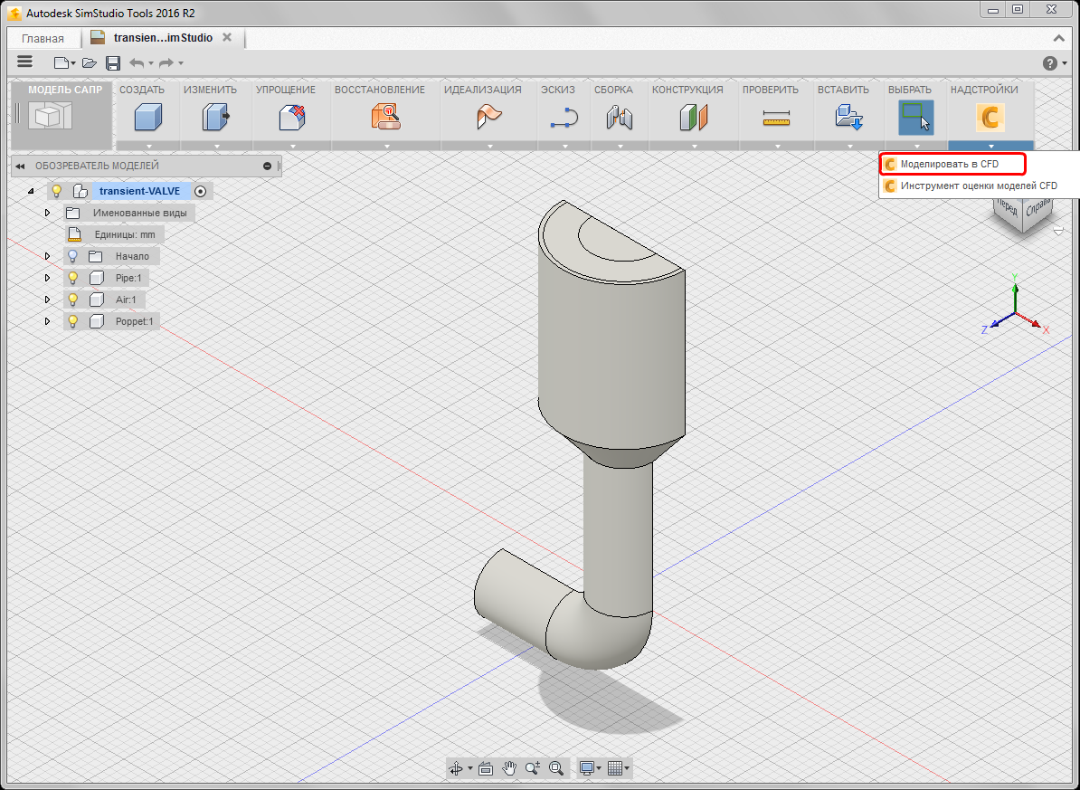 Разверните меню Надстройки и выберите Моделировать в CFD.
