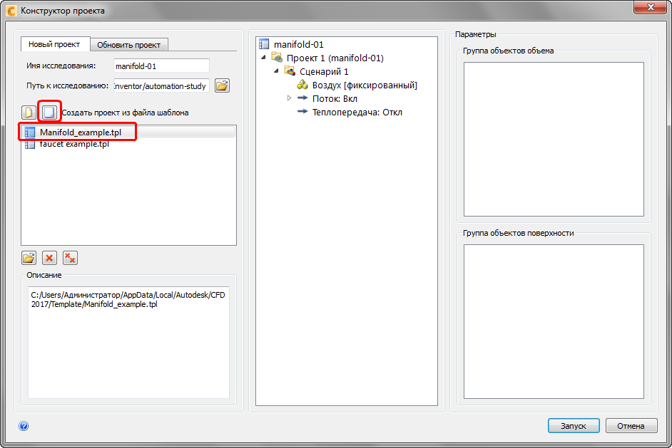 Нажмите значок Создать из шаблона и выберите Manifold_example.tpl.