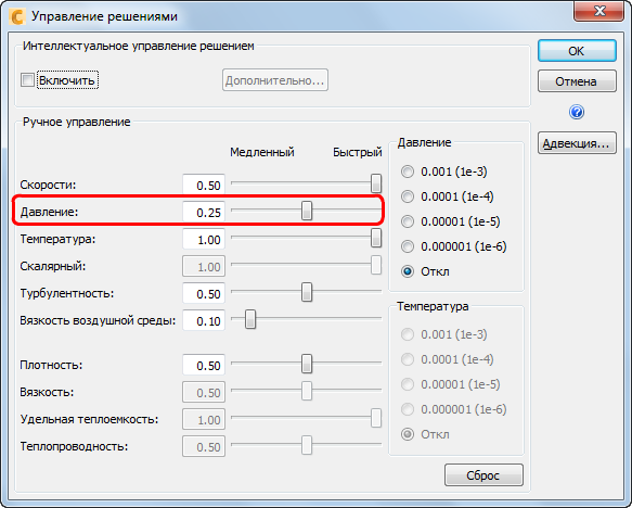 Нажмите кнопку Контрольное решение и переместите ползунок Давление, на 0.25