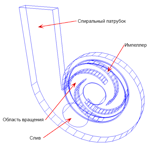 В этом уроке мы будем имитировать поток в центробежном насосе с задними стреловидными лопастями. Модель состоит из спирали, входной трубы, крыльчатки и вращающейся области: