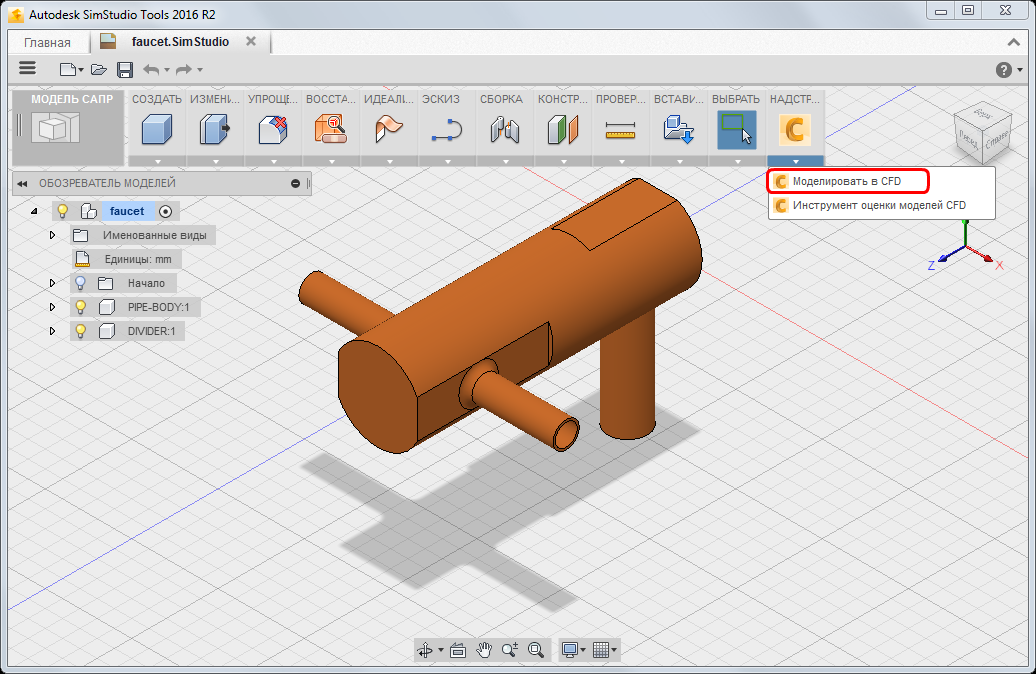 Разверните меню Надстройки и выберите Моделировать в CFD.