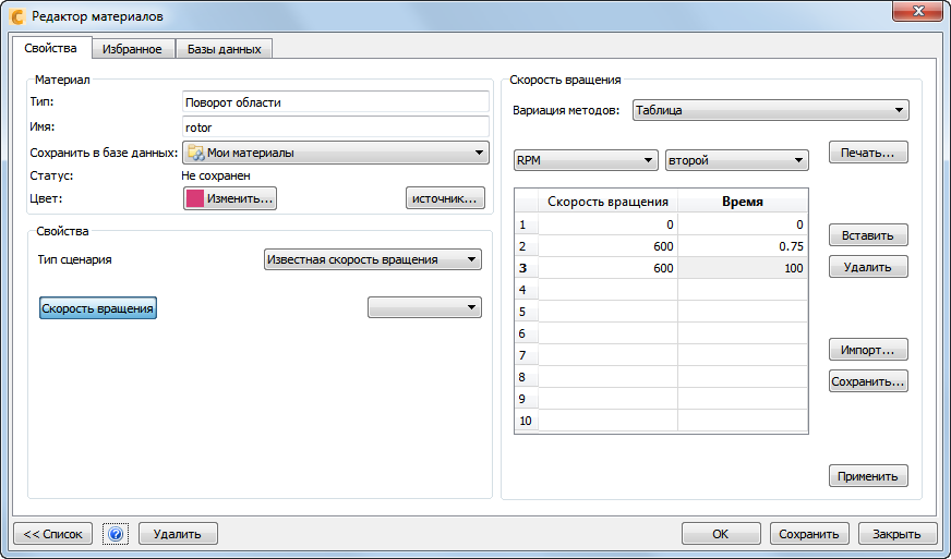 Единицы измерения скорости вращения = об/мин; Единицы времени = секунда
