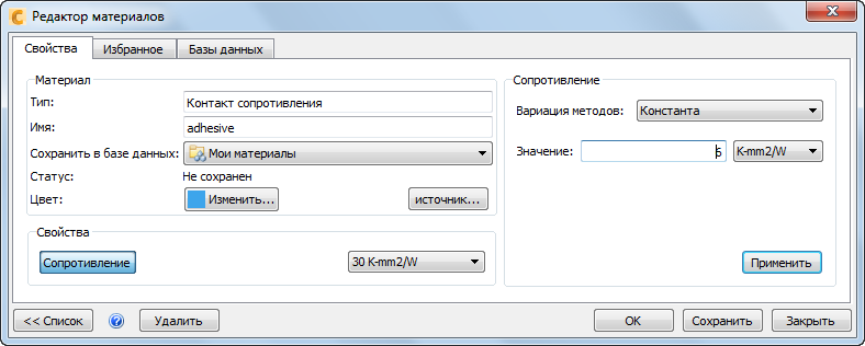 Выберите Мои материалы в меню Сохранить в базе данных.