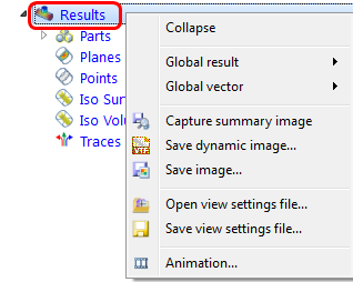 You can use the Results branch and sub-branches to create, remove, and control the appearance of the results visualization entities. The commands in the right-click menus are also located in the on-model context menus and in the ribbon context menu for each entity type. The Design Study bar results branches collect these commands into a single area and are a convenient way to interact with the results tools.