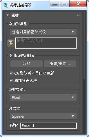 “参数编辑器”是一个包含三个卷展栏的对话框:第一个卷展栏设置属性的常规选项;中间的卷展栏设置有关当前参数类型的选项;第三个卷展栏可以预览属性用户界面 (UI)。
