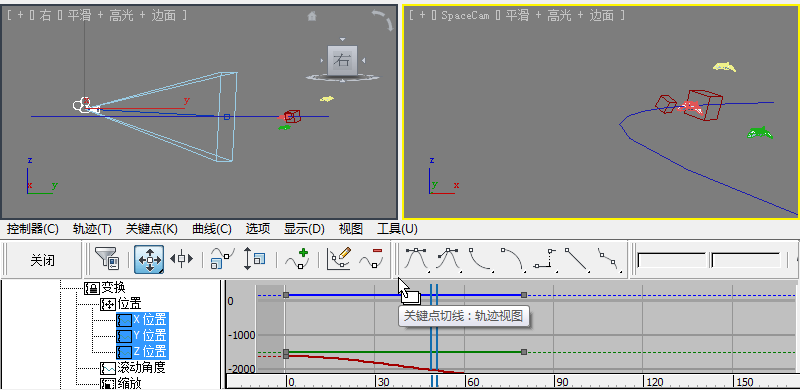 可以展开轨迹栏,以显示曲线。单击位于轨迹栏左端的 (打开迷你曲线编辑器)。将用控制器和关键点窗口,以及“轨迹视图”工具栏替换时间滑块和轨迹栏。通过在菜单栏和工具栏之间拖动边框(在空工具栏区域中执行此操作),可以调整轨迹栏窗口的大小。