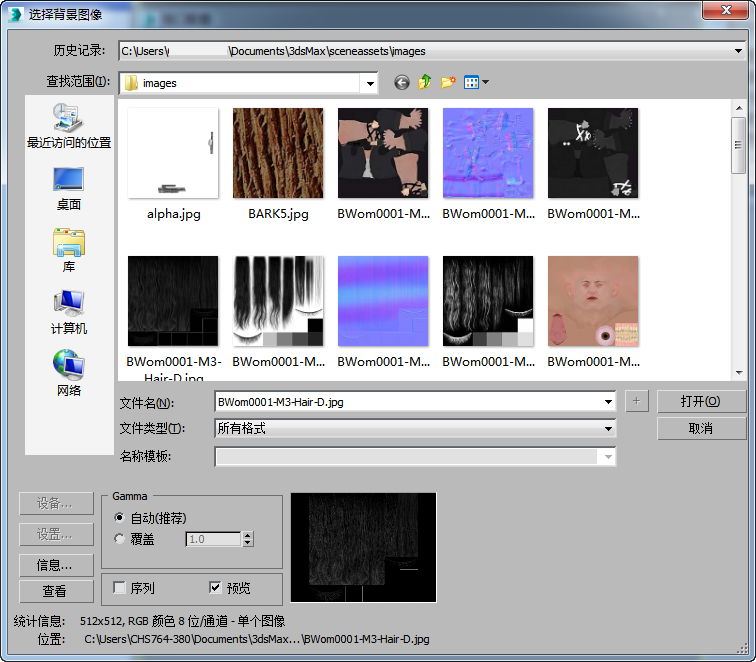 “选择背景图像”对话框可用于选择视口背景的文件或文件序列。