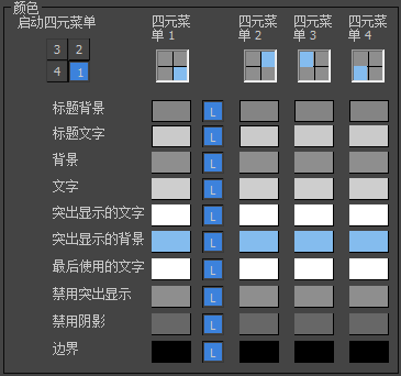 如果四元菜单元素的颜色被锁定(由一个按下的“L”按钮所指示),每个分隔的四元菜单将共享同一颜色,当更改其中一个四元菜单中的颜色时,所有四元菜单的颜色都将会更改。