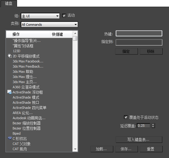 使用“键盘”面板可以创建自己的键盘快捷键。可以为 3ds Max 中可用的大多数命令指定快捷键。