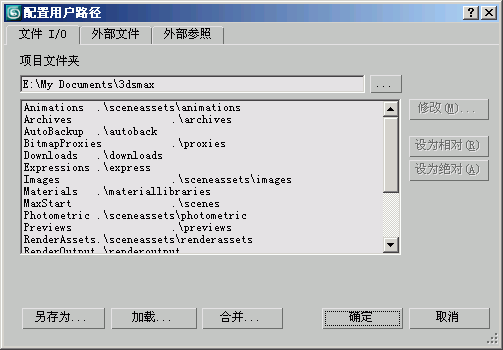 “配置用户路径”对话框的“文件 I/O”面板包含用户在其中存储文件的大多数文件目录。