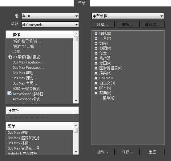 - 打开“自定义用户界面”对话框的“菜单”面板。