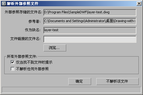 - 不解析此外部参照文件,但会提示文件链接中要解析的其他任意外部参照。