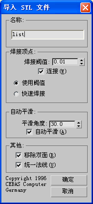- 快速焊接如果打开,STL 导入使用为 STL 格式优化的焊接算法。这种方法要比标准 3ds Max 焊接快三十倍,强烈建议您使用此方法。