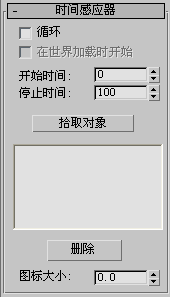 “时间感应器”辅助对象用于添加基于时间的动画控件,如特定对象的开始和结束帧,以及循环。使用此辅助对象可以在几个触发器上分割对象的动画关键点,以在加载 .wrl 文件时自动启动动画,或使动画不停地循环。