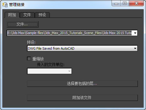 使用由“预设”列表中的预设(如果您选择了一个预设)指定的设置,将选定文件附加到场景中。