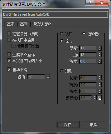 “文件链接设置: DWG 文件”对话框中的“样条线渲染”面板将控制链接 DWG 或 DXF 文件时形状在场景中的显示方式。您可以控制形状的外观、形状的平滑度、贴图坐标以及是否可以对它们进行渲染。