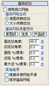 实体对象是按程序定义的,因此必须转换为可供渲染的网格对象。这些控件确定了软件执行此转换的方式。默认方法为生成一个根据视图进行渲染的新网格。另外,渲染可以使用视口网格设置生成的视口网格。大多数情况下,默认设置完全可以完成渲染网格的创建操作。