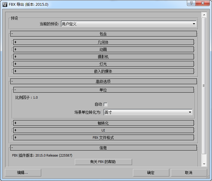 如果希望 3ds Max FBX plug-in自动识别、设置并转化传入文件的单位以与主机应用程序的单位匹配,请激活“自动”选项。