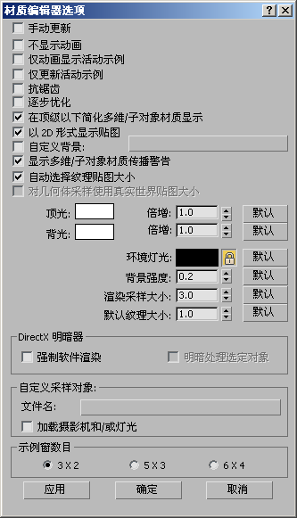 - 在不离开“材质编辑器选项”对话框的情况下,应用当前设置,“示例窗”组中的更改除外。调整示例窗的灯光值时,该选项非常有用。