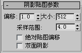 当已选择阴影贴图作为灯光的阴影生成技术时,显示“阴影贴图参数”卷展栏。可以在“常规参数”卷展栏中选择此选项。
