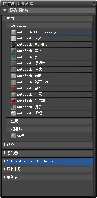 多数“材质/贴图浏览器”界面只是按库和组进行组织的材质、贴图和控制器的列表。每个库和组都有一个带有打开/关闭 (+/-) 图标的标题栏,该图标可用于展开或收缩列表。组可以有子组,子组有自己的标题栏,某些子组可以有更深层的子组。
