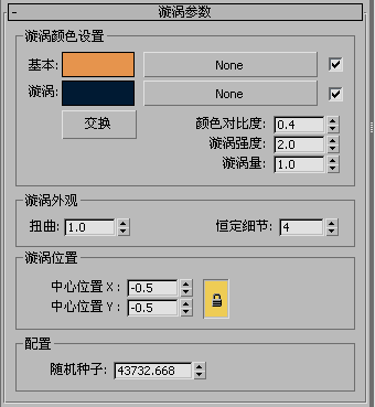 - 旋涡效果的基础层。单击色样以更改该颜色。单击“无”指定贴图以替换颜色。该复选框可启用或禁用贴图。
