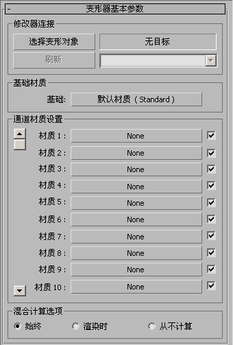 如果混合多种活动材质,3ds Max 的运行速度可能减慢。使用此组中的选项可以控制开始计算变形结果的时间。