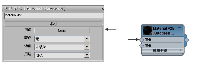 可贴图 Base Hardwood 组件(左侧)显示为材质节点中的 Base Hardwood 窗口(右侧)。