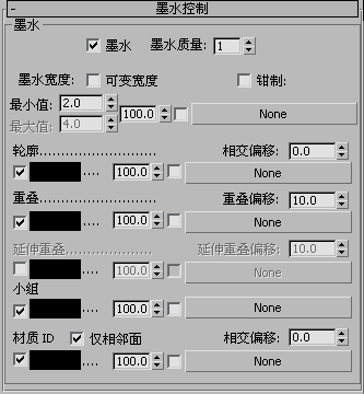 每个墨水组件都有贴图控件:“宽度”、“轮廓”、“重叠”、“延伸重叠”、“平滑组”和“材质 ID”。它们的工作方式与针对材质的绘制组件的工作方式相同,如上所述。