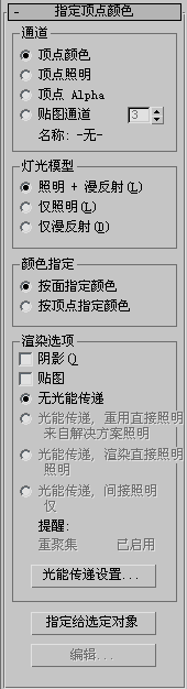 其他选项“渲染直接照明”也位于“渲染参数”卷展栏上,造成直接照明不在相应网格中保存。这对应于使用选项“光能传递”和“渲染直接照明”,在这种情况下,“指定顶点颜色”从光能传递网格获取直接照明,而且单独渲染直接照明;或者对应于使用选项“光能传递”和“只用间接照明”,这时“指定顶点颜色”对顶点完全不应用直接照明。