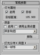 使用光度学灯光时,会显示此“常规参数”卷展栏。这些控件用于启用和禁用灯光,并且排除或包含场景中的对象。通过它们,您还可以设置灯光分布的类型。