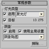 此“常规参数”卷展栏专用于标准灯光。这些控件用于启用和禁用灯光,并且排除或包含场景中的对象。