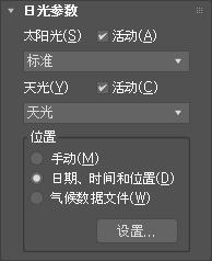 通过“日光参数”卷展栏可以定义日光系统的太阳对象。您可以设置太阳光和天光行为。