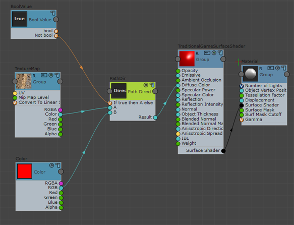 在此示例中,BoolValue 图形节点是控制 PathDir 采用输入 A 还是输入 B 的开关。如果 Bool 连接到 PathDir,则采用输入 A。如果 Not Bool 连接到 PathDir,则采用输入 B。BoolValue 并不直接为漫反射颜色提供任何值。