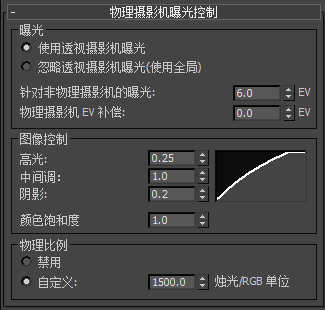 使用“曝光值”和颜色-响应曲线设置物理摄影机的曝光。