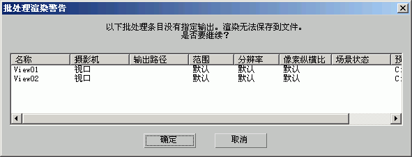 “批处理渲染警告”对话框的两种格式包含显示在“批处理渲染”对话框中的“任务对列”列。主要区别在于复选框,使用该复选框可以指定渲染时使用哪一个摄影机。该“任务队列”只显示可能会覆盖保存文件的摄影机或没有为输出设置路径/文件名的摄影机,或者只显示无效的数据路径。