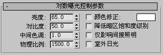 “对数曝光控制”使用亮度、对比度以及场景是否是日光中的室外,将物理值映射为 RGB 值。可以将其与默认扫描线渲染器结合使用。“对数曝光控制”比较适合动态范围很高的场景。