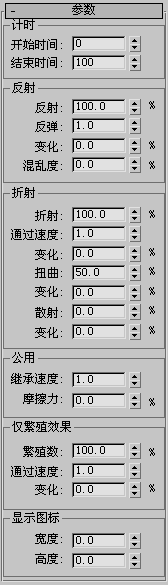 这些设置仅影响那些被设置为“碰撞后繁殖”的没有从泛方向导向器反射或折射的粒子。请参见“粒子繁殖”卷展栏(粒子阵列)。“繁殖”百分比微调器的工作方式类似于“反射”和“折射”百分比微调器,但前者是第 3 个被处理的对象。因此,如果设置“反射”或“折射”为 100%,则这些设置不会影响任何粒子。还要注意,反射或折射的粒子在碰撞后繁殖,不管此组中的设置如何。