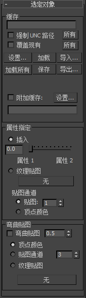 “选定的对象”卷展栏用于控制模拟缓存、使用纹理贴图或插补来控制并模拟布料属性(可选),以及指定弯曲贴图。此卷展栏只在模拟过程中选中单个对象时显示。