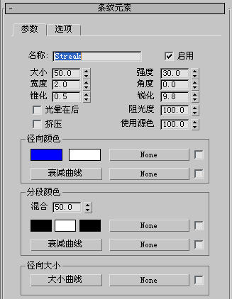 - 混合在“径向颜色”和“环绕颜色”中设置的颜色。如果将微调器设置为 0,将只使用“径向颜色”中设置的值,如果将微调器设置为 100,将只使用“截面颜色”中设置的值。0 到 100 之间的任何值将在两个值之间混合。