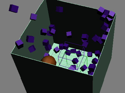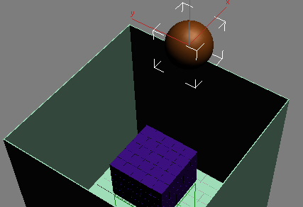 球体与粒子阵列碰撞,使这些粒子到处散布,彼此撞击并在长方体内反弹。如果将动画长度延长为大约 300 帧,则可以看到粒子开始飞出长方体顶部的开口。