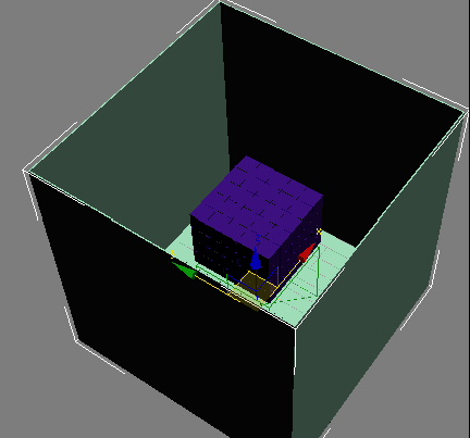- 在“透视”视口中,添加一个由块组成的长方体基本体,并留有剩余空间;该基本体应该是一个一面包含 150 个单位的立方体。使长方体以块为中心。