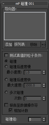 - 列出在 MassFX 模拟中充当导向器的非粒子对象。这是“mParticles 碰撞”测试和标准“碰撞”之间的主要差异:指定已应用“粒子流碰撞图形(WSM)”修改器的几何体对象,而不使用导向器类型的空间扭曲。“导向器”列表只能包含这些对象。如果几何体对象不是通过“粒子流碰撞图形”修改的,则它不能被视为“mParticles 碰撞”测试的导向器。