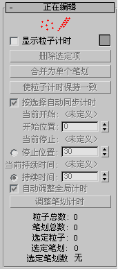“编辑”卷展栏可用于删除不需要的粒子种子或全部笔划,调整笔划/粒子计时,选择粒子/笔划,以及将选择数据传递给“出生绘制”操作符和“放置绘制”操作符。无法直接通过标准的 3ds Max 工具(如“移动”和“旋转”)操纵选定粒子种子。