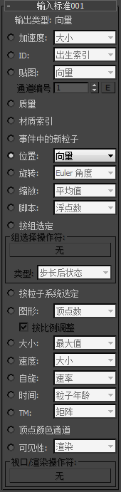 “输入标准”复制当前粒子系统中的常规粒子属性,如位置、速度、缩放等。除没有“代理系统索引”控件以外,这些参数与“输入代理”子操作符相同。