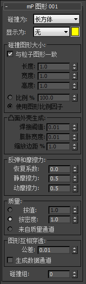 注: 与粒子图形相似,即使当粒子移动到其他事件时,此处指定的碰撞图形也会持续在整个粒子流中。此外,定义后的碰撞图形将无法由连续事件中的其他“mParticles 图形”操作符更改。