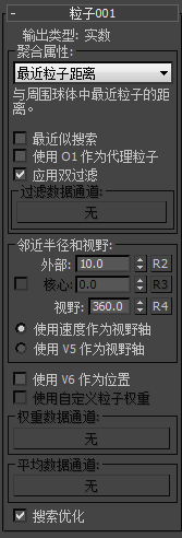 - 启用时,可加快聚合,但会降低精度。仅可与“最近粒子距离”、“最近粒子索引”和“最近粒子位置”一起使用。使用大量粒子时启用该选项。默认设置为禁用。