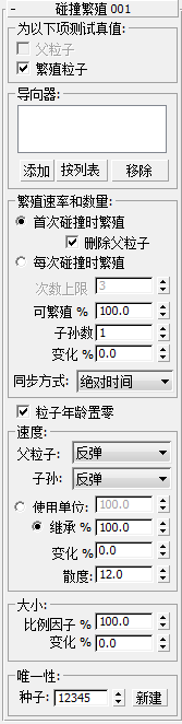 “碰撞繁殖”使用与一个或多个导向板空间扭曲碰撞的现有粒子创建新粒子。