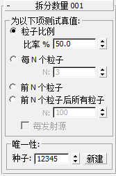 比率 指定将测试为 True 的粒子的百分比。可设置动画。默认设置为 50.0%。